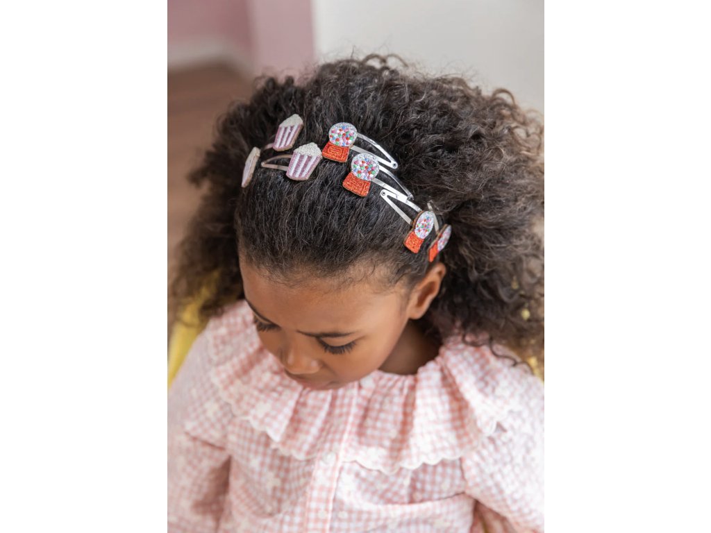 Pár třpytivých sponek s popcornem od francouzské značky Luciole et Petit Pois je nádherným doplňkem pro úpravu všech typů dětských vlásků.