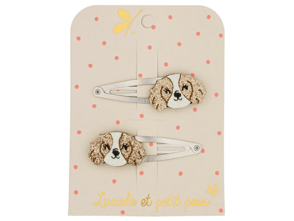 Pár třpytivých sponek s pejskem od francouzské značky Luciole et Petit Pois je nádherným doplňkem pro úpravu všech typů dětských vlásků.