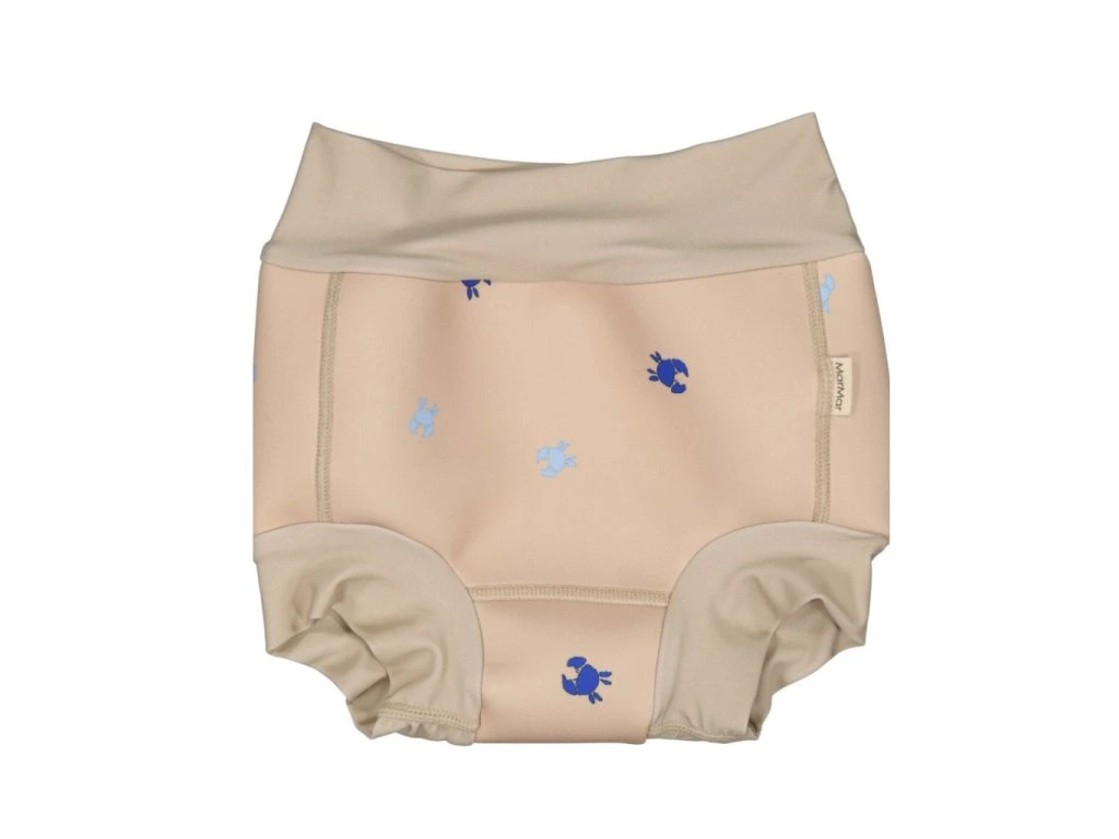 Roztomilé plavkové šortky pro miminka se širokým elastickým pasem, který krásně drží přes bříško, ale ani trošku nikde netlačí. Šortky mají béžovou barvu a jsou zdobené modrými krabíky.