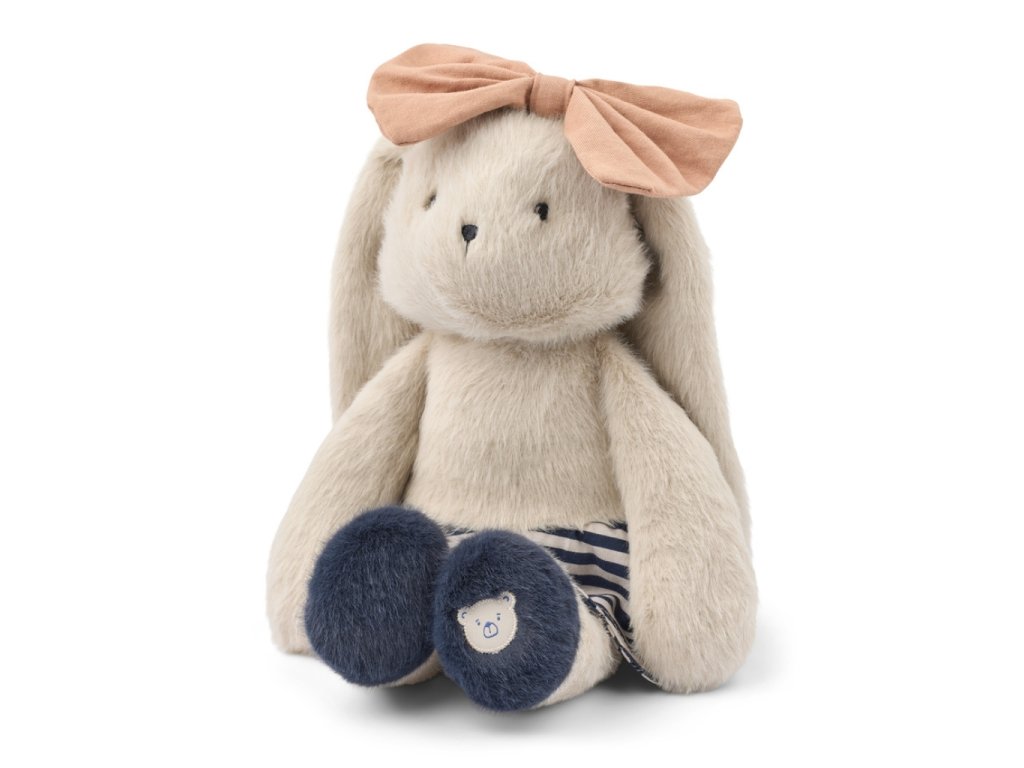 Liewood slaví 10 let, a proto ikonický plyšový zajíček dostal zbrusu nový kabátek! Má pruhovanou tmavě modrou sukýnku a růžovou mašli.