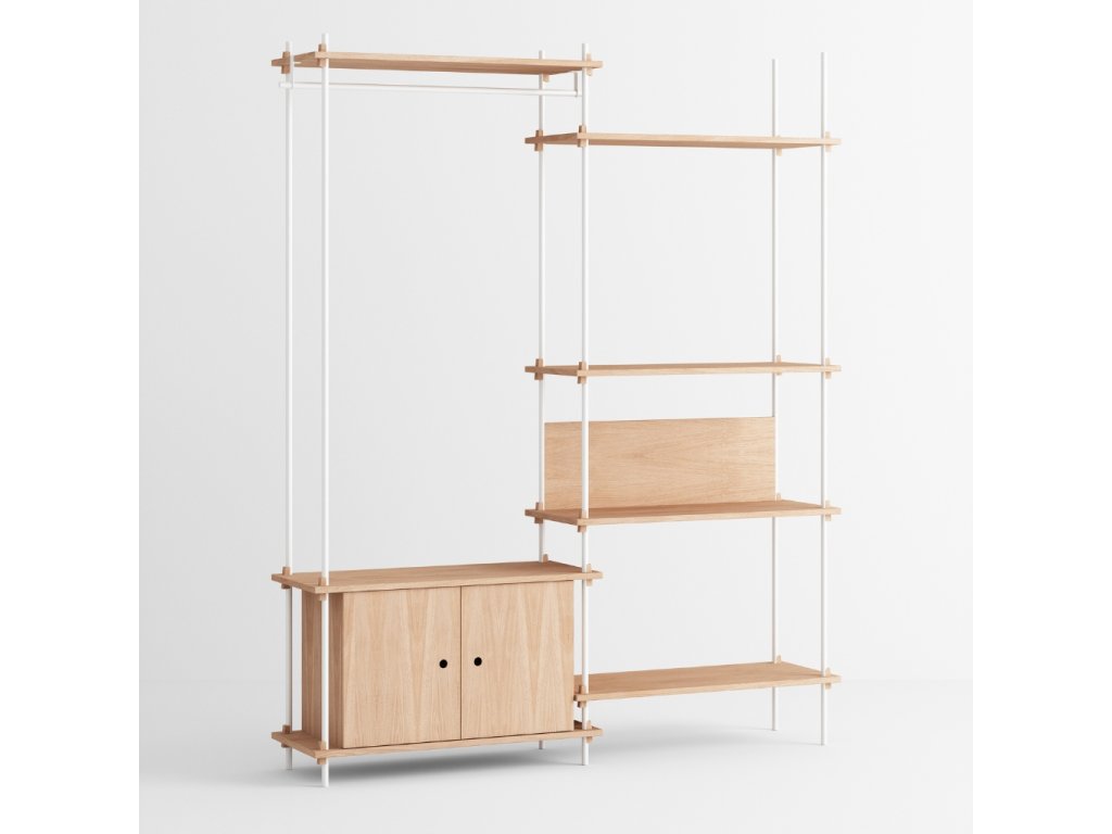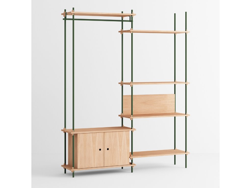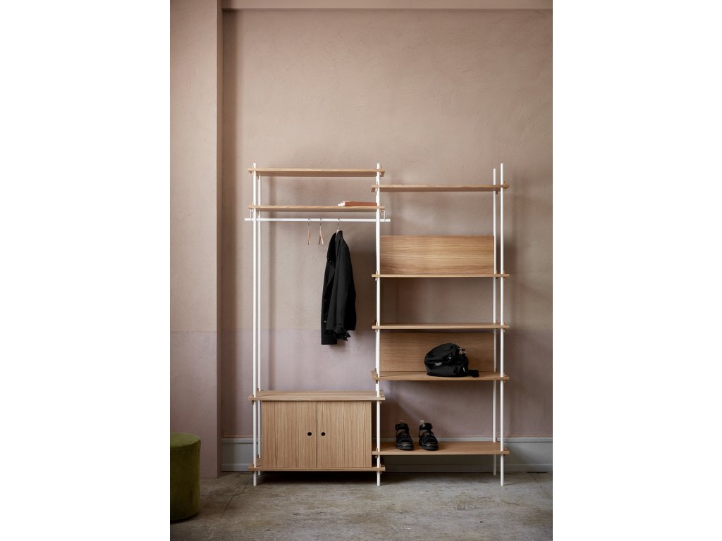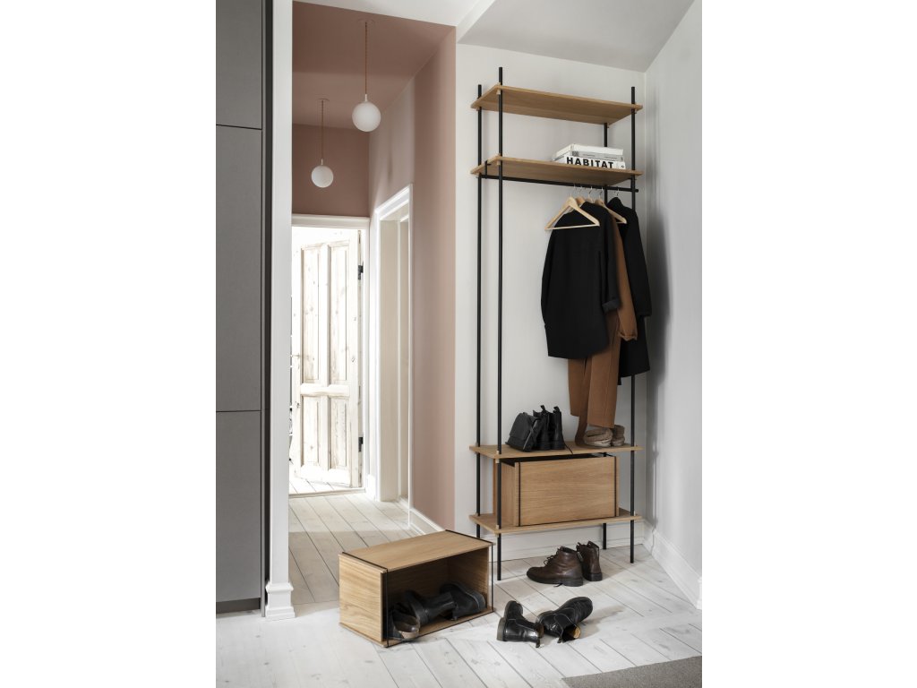 Předdefinovaná policová sestava S.200.2.G. dánské značky MOEBE obsahuje šatní tyč, proto se bude nejlépe hodit do vaší předsíně na zavěšení kabátů, bund a na odložení čepic, šál i bot. Funkci otevřené skříně skvěle splní v dětském pokoji, ložnici nebo šatně. A pokud vás tato forma využití přestane bavit, jednoduše tyč sundáte a máte policový systém vhodný kamkoliv, kam si jen vzpomenete.