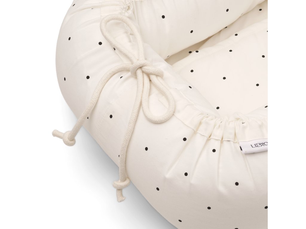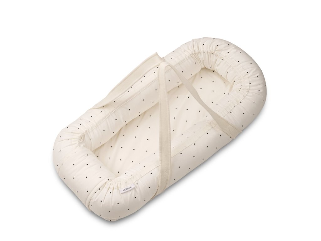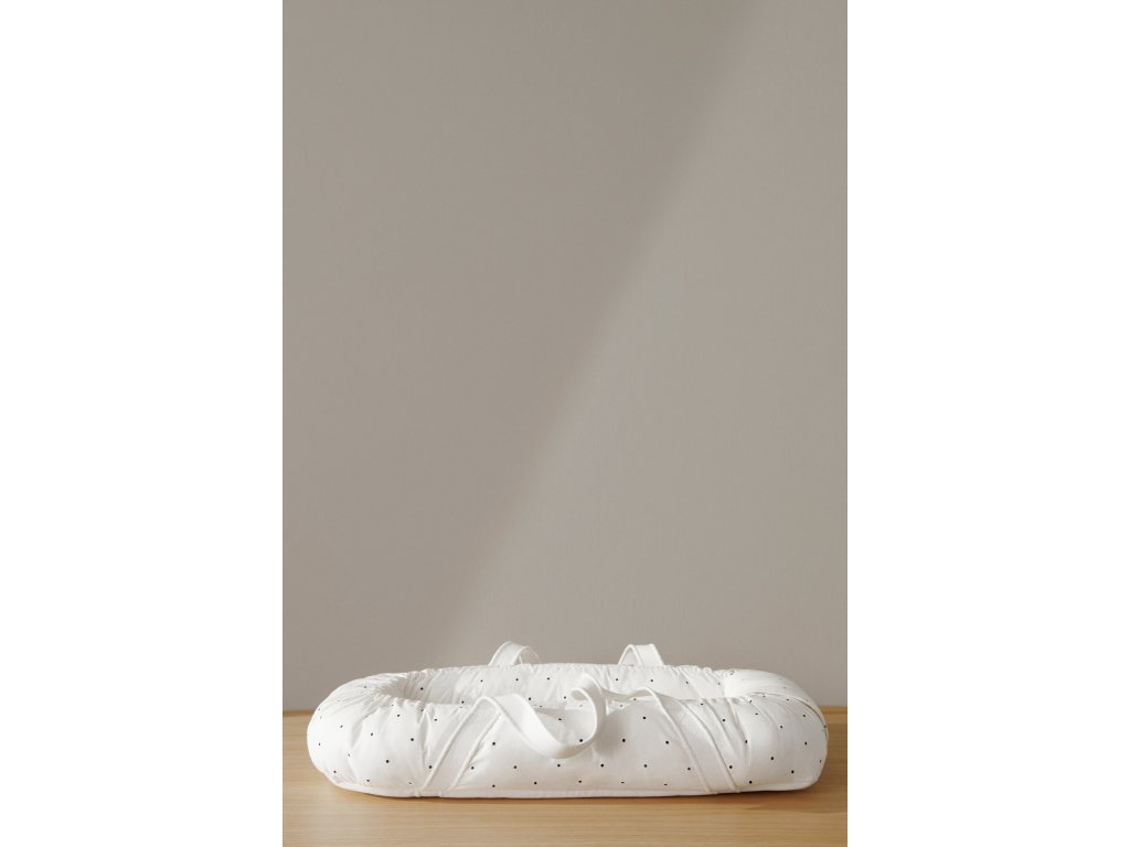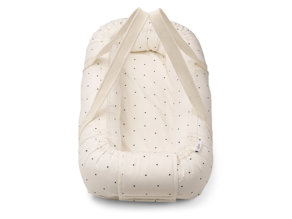 Hnízdečko pro miminko v bílé barvě s černými puntíky od dánské značky Liewood. Hnízdečko tvoří pevná dřevěná deska, která se stará o bezpečnost během přenášení, měkké boční mantinely, matrace, v pračce pratelný potah z organické bavlny a dostatečně dlouhé popruhy.