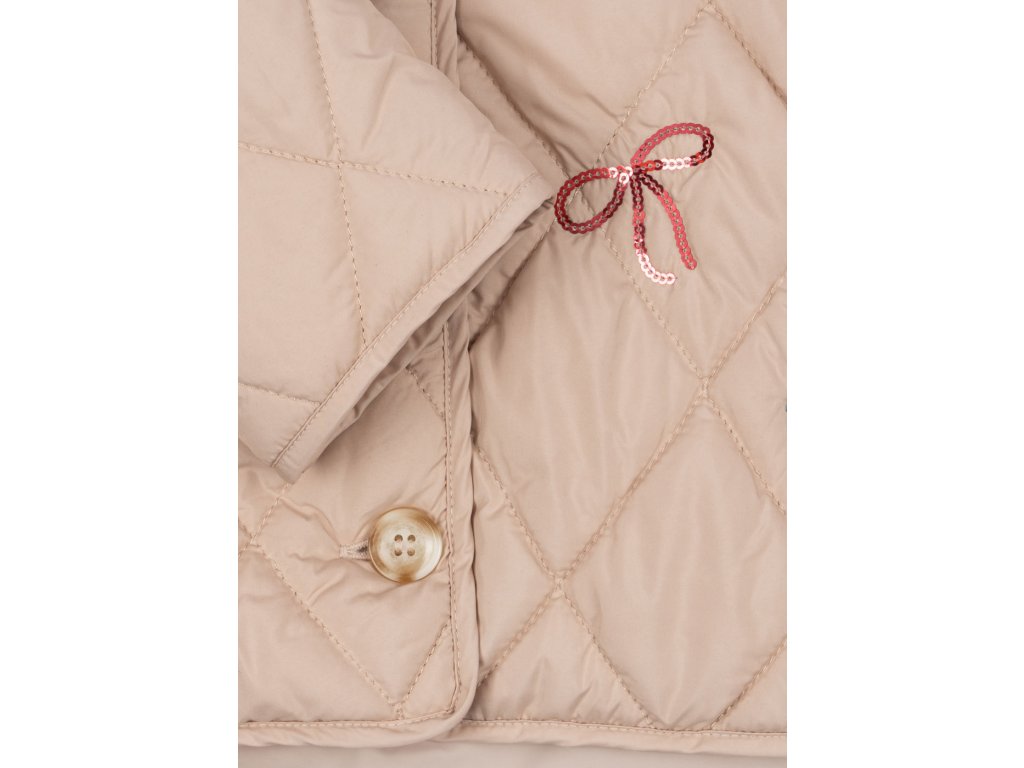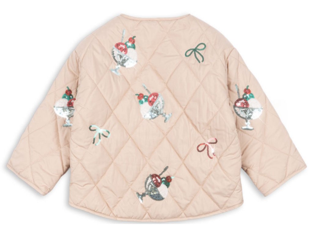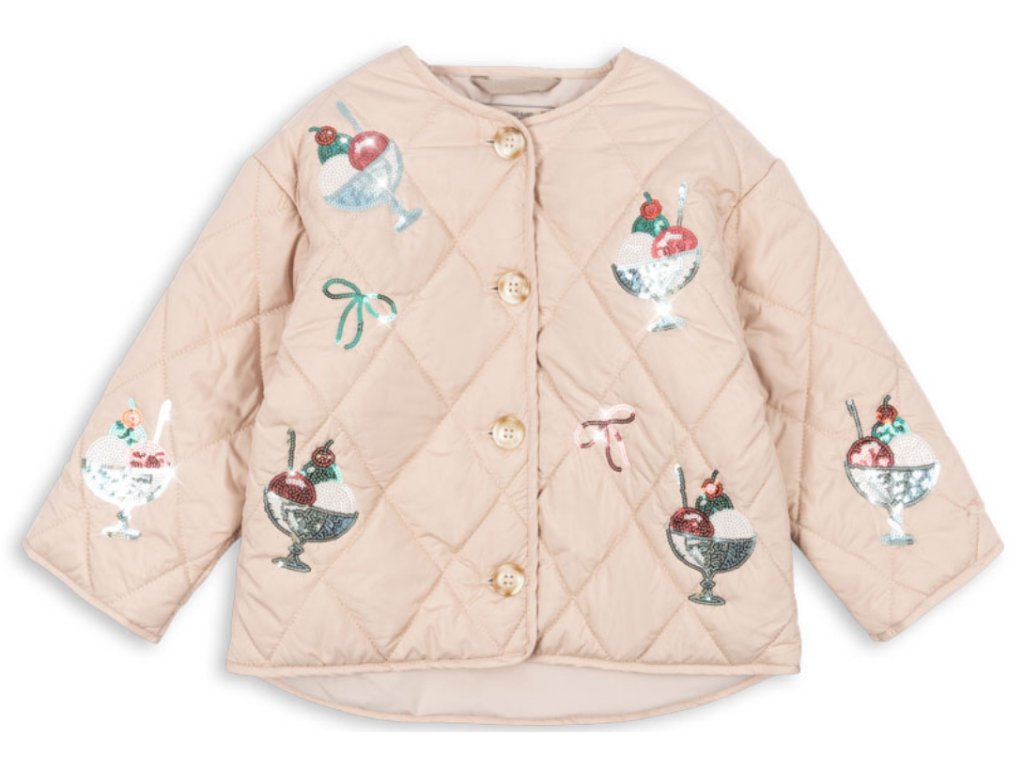 Na tuhle prošívanou bundičku s flitrovými zmrzlinkami jsme se táák moc těšili a hlasíme do světa, že je nejen stylová, ale i neuvěřitelně praktická. Díky své lehkosti ji snadno složíte a přibalíte s sebou na cesty do batůžku, tašky nebo příručního zavazadla. Bundička je připravená zahřát vaší malou parádnice kdekoliv. Na jaro, na léto, na podzim, k šatičkám, sukni i kalhotám. 🍦