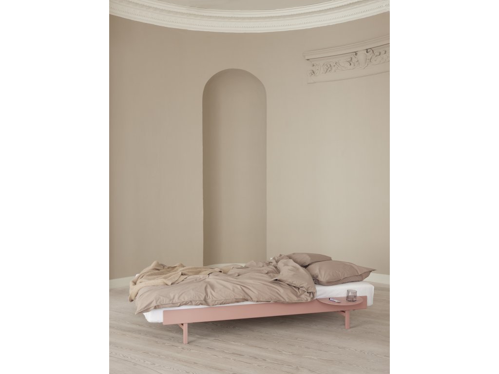 Minimalistický ocelový rám je dostupný v několika barevných variantách i v nerezovém provedení. Vybrat si můžete také nižší nebo vyšší verzi podle toho, co vám při odpočinku nejvíc vyhovuje. Postel lze navíc doplnit o jeden nebo dva odkládací stolky, které na její konstrukci přirozeně navazují a rozšiřují její každodenní funkčnost.