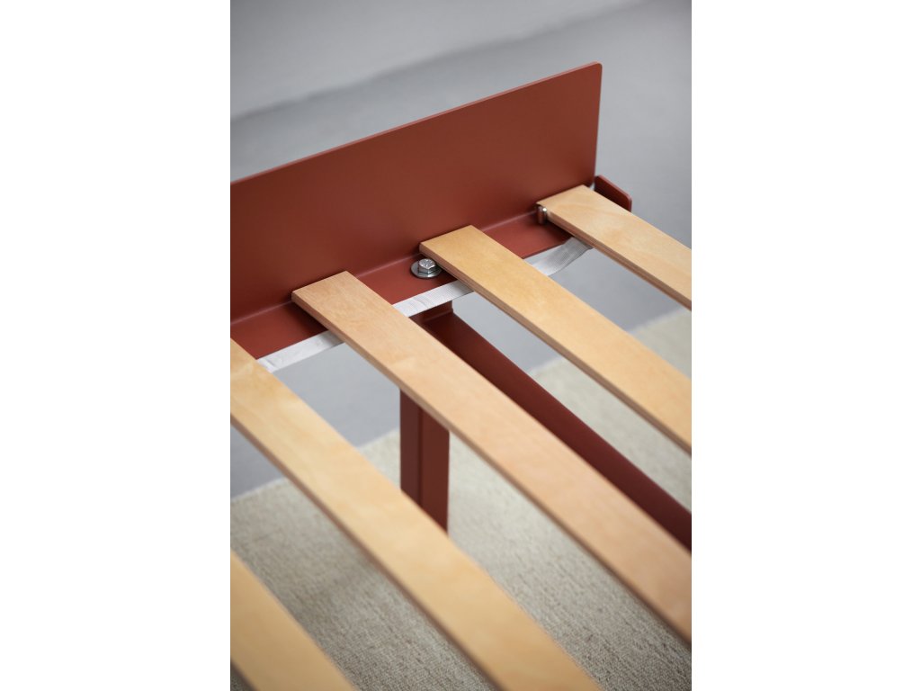 Minimalistický ocelový rám je dostupný v několika barevných variantách i v nerezovém provedení. Vybrat si můžete také nižší nebo vyšší verzi podle toho, co vám při odpočinku nejvíc vyhovuje. Postel lze navíc doplnit o jeden nebo dva odkládací stolky, které na její konstrukci přirozeně navazují a rozšiřují její každodenní funkčnost.