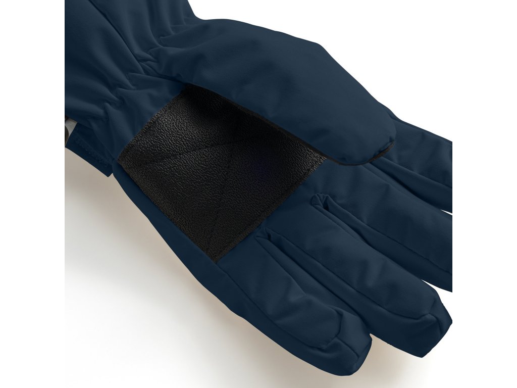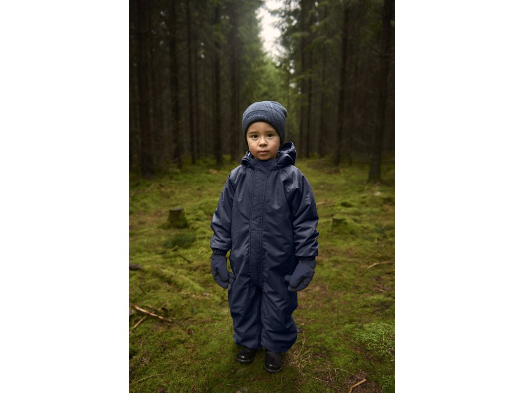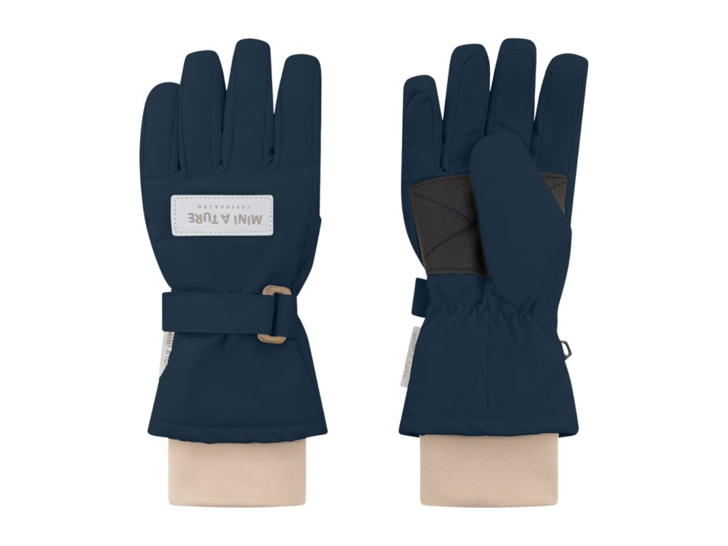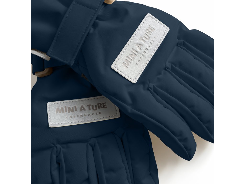 Zimní tmavě modré prstové rukavice jsou 100% větru a voděodolné, prodyšné a dostatečně teplé i pro velmi chladnou zimu. Mají pružný a pomocí gumičky stahovatelný lem kolem zápěstí, aby se do nich nedostal déšť a sníh. Na zápěstí mají nastavitelné pásky na suchý zip, díky kterým rukavice dětem nesklouznou. Po stranách a na hřbetu ruky jsou reflexní prvky s logem MINI A TURE.