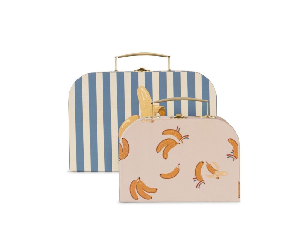 Sada dvou roztomilých kartonových kufříků pro děti se vzorem proužků a banánů od značky Konges Sløjd. Ideální úkryt pro autíčka, panenky, šperky, tajné poklady i krásný doplněk do dětského pokojíčku.