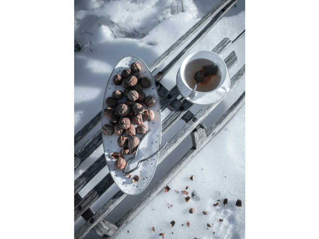 Porcelánový oválný talíř od norské značky Wik & Walsøe je jako stvořený pro chvíle, kdy se vaši nejbližší setkávají u společného stolu, aby sdíleli radost, klid a pohodu svátečních dnů. Jeho jemný design se sněhovými vločkami a srdíčky přináší do vašeho domova tu pravou vánoční atmosféru. Představte si, jak na něj servírujete první várku čerstvě upečených vanilkových rohlíčků, tu nejsladší vánočku kdykoliv během prosincového rána, za okny mezitím padají sněhové vločky a vy jen si jen tak vychutnáváte kouzlo okamžiku.