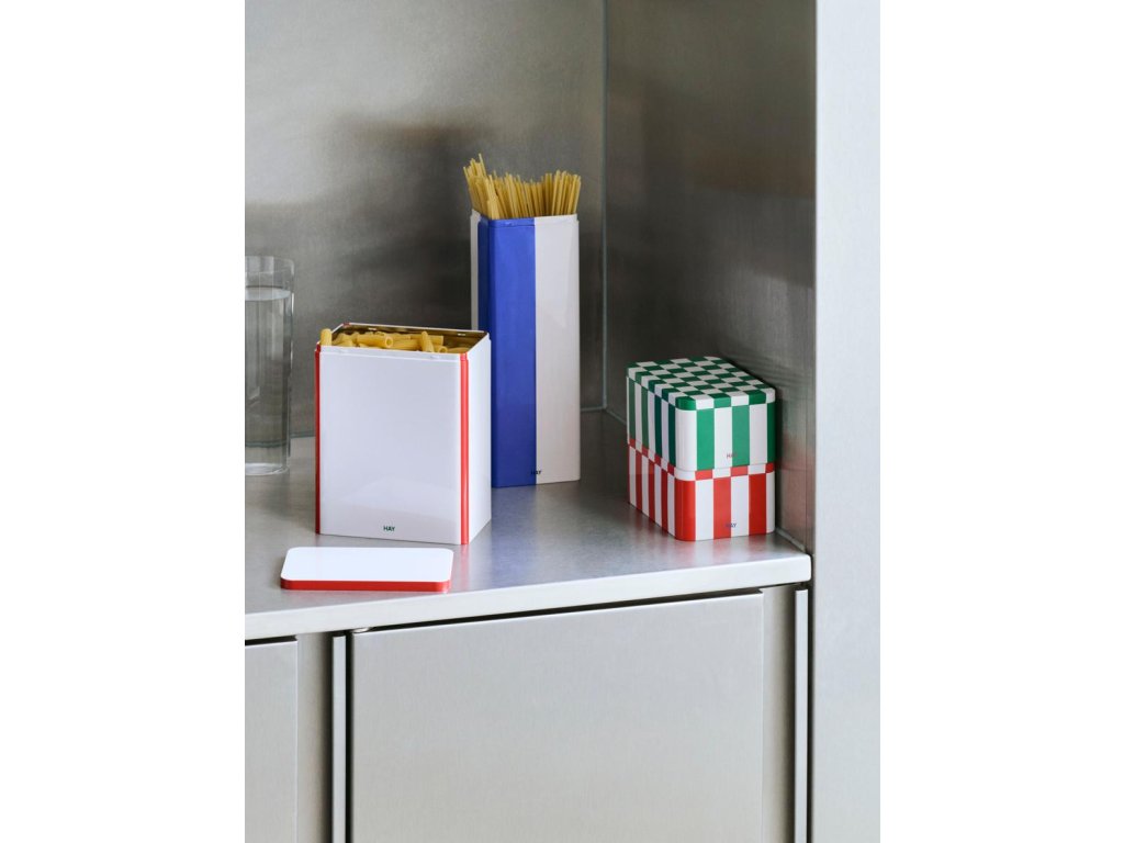 Plechová skladovací nádoba od dánské značky HAY vyniká svým jedinečným designem. Její kombinace červeno-bílých šachovnicových kostek a pruhů hravě ozdobí polici, stolek nebo jakýkoliv jiný prostor ve vaší domácnosti. Je vyrobená z vysoce kvalitního materiálu, který zaručuje její dlouhou životnost a odolnost. Má praktické, skvěle těsnící víčko, proto ji nejvíce využijete ve vaší kuchyni na uskladnění suchých potravin, od mouky, přes těstoviny, až po zrnkovou kávu a různé cukrovinky.