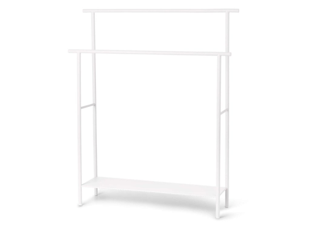 Stojan na ručníky z kolekce Dora od ferm LIVING je nejen designově nádherným, ale především praktickým pomocníkem, který pomůže udržet pořádek ve vaší koupelně. Na dvě práškově lakované ocelové tyče můžete pověsit mokré ručníky, a tím velice snadno urychlit proces jejich schnutí. Ve spodní části stojanu máte k dispozici polici, kam se krásně dají naskládat čisté ručníky nebo jiné koupelnové potřeby.