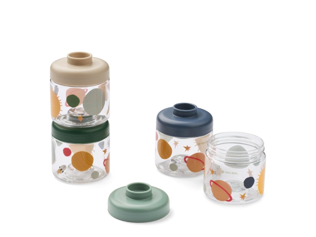 Tyto roztomilé boxíky s vesmírnými planetkami nejen skvěle vypadají, ale především nabízejí chytré řešení pro skladování a přípravu dětského jídla. Jsou bezpečné pro ukládání potravin v lednici i mrazáku. Díky jejich stohovatelnosti je můžete snadno naskládat na sebe, což oceníte zejména na cestách nebo při pobíhání po městě. Boxíky jsou vyrobené z tritanu, který je bezpečný, velice odolný a vhodný do myčky nádobí.