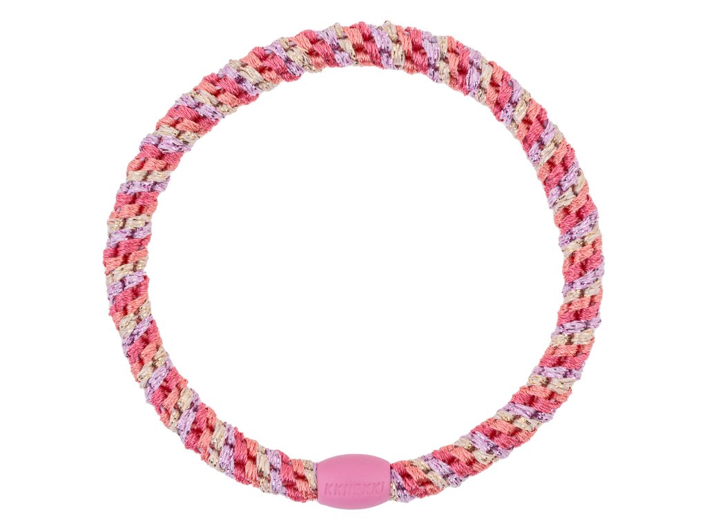 Tenká gumička do vlasů od značky Bon Dep v jedinečné kombinaci barev – malinová, lososová, levandulová a béžová se zlatými třpytkami.