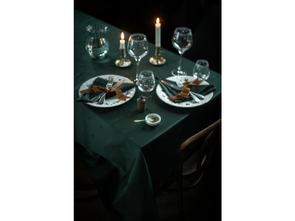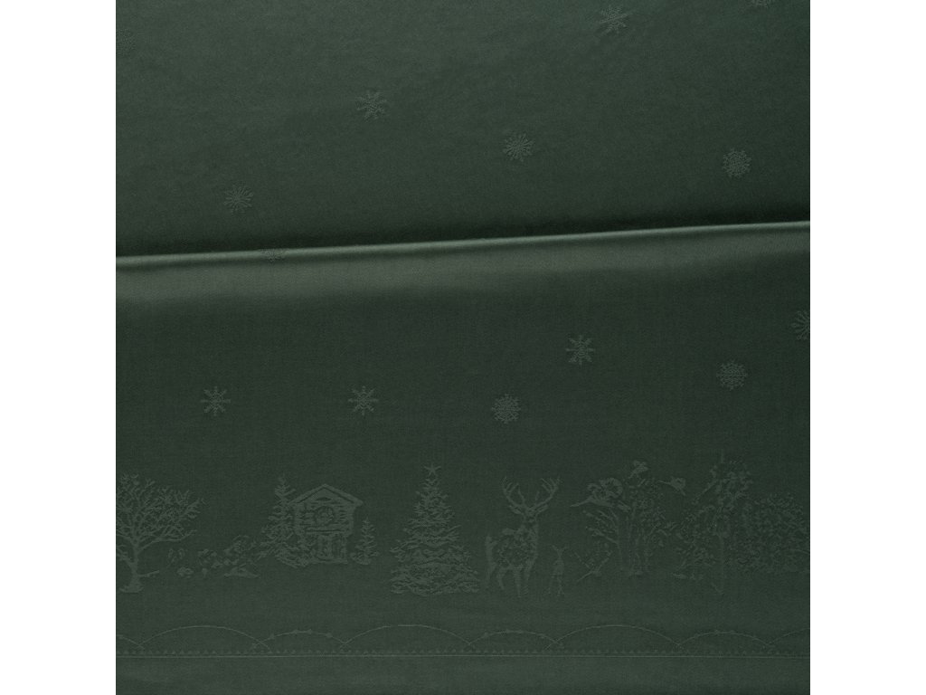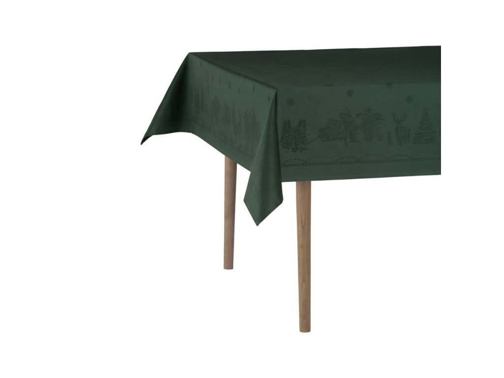 Damaškový ubrus Julemorgen od Wik & Walsøe přináší kouzlo severských Vánoc přímo k vašemu stolu. Má tradiční zelenou barvu a jemně tkaný vzor, který vypráví příběh tamějších zasněžených lesů, roztomilých lesních zvířátek a útulných dřevěných srubů. Naprosto dokonale ladí se svátečním porcelánem ze stejné kolekce.