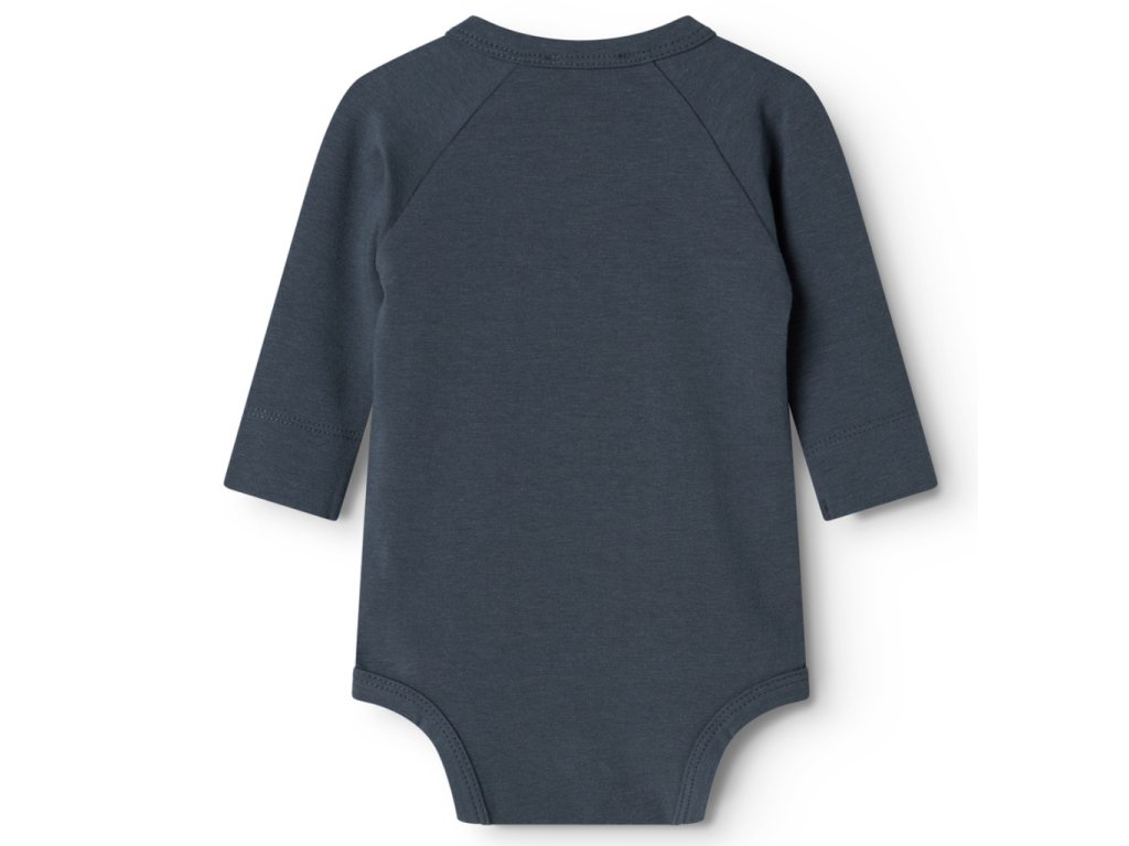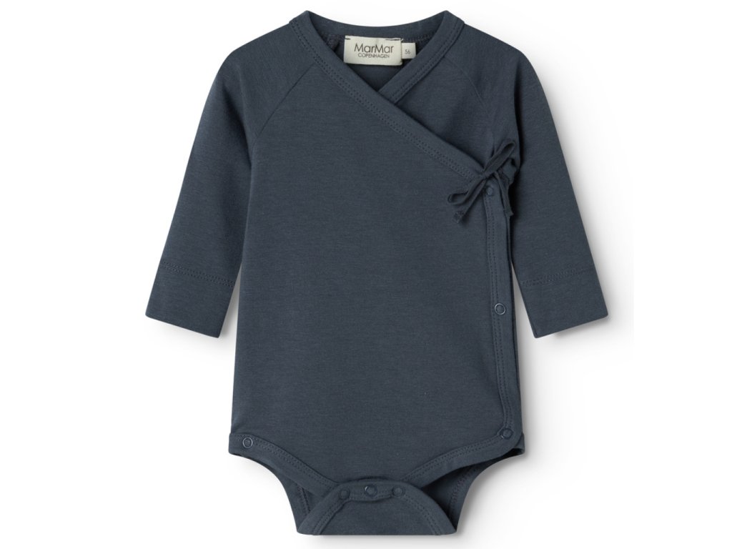 Tmavě modré zavinovací body s dlouhým rukávem s roztomilým pikotovým stehem od značky MarMar Copenhagen. Body se zapíná i rozepíná pomocí patentek po celém obvodu, což vám maminkám i tatínkům výrazně usnadňuje jeho oblékání. Na jedné straně se zavazuje pomocí mašličky.