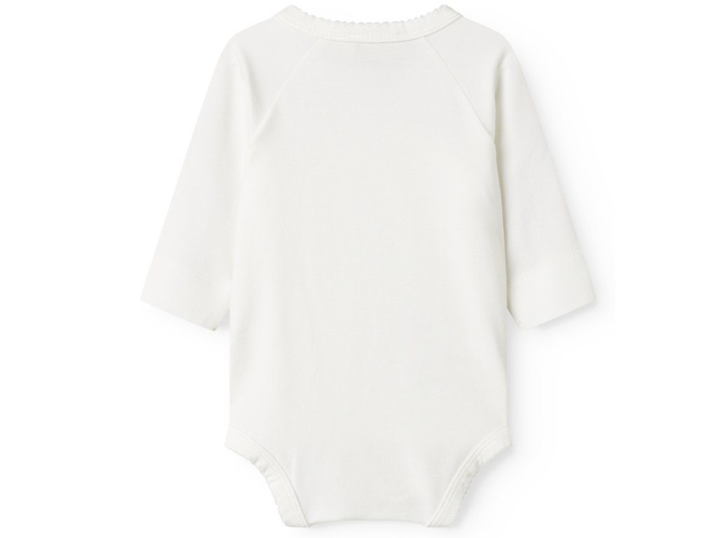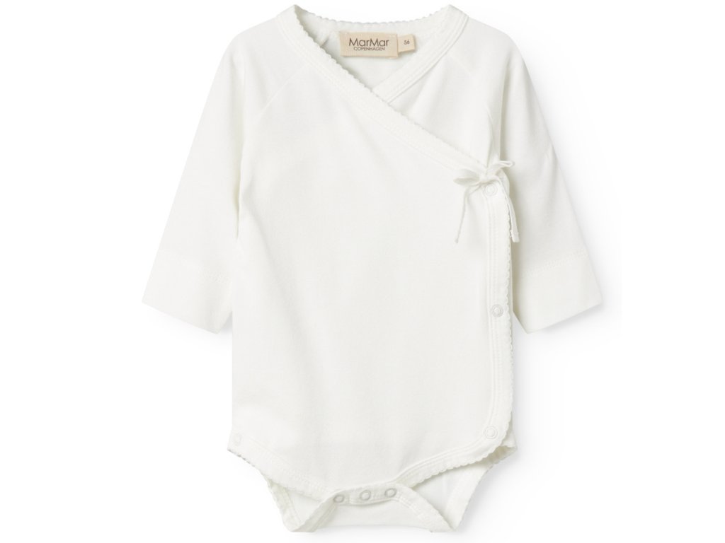 Bílé zavinovací body s dlouhým rukávem s roztomilým pikotovým stehem od značky MarMar Copenhagen. Body se zapíná i rozepíná pomocí patentek po celém obvodu, což vám maminkám i tatínkům výrazně usnadňuje jeho oblékání. Na jedné straně se zavazuje pomocí mašličky.
