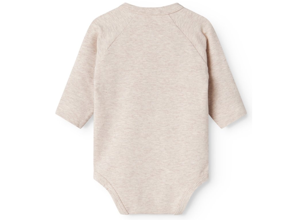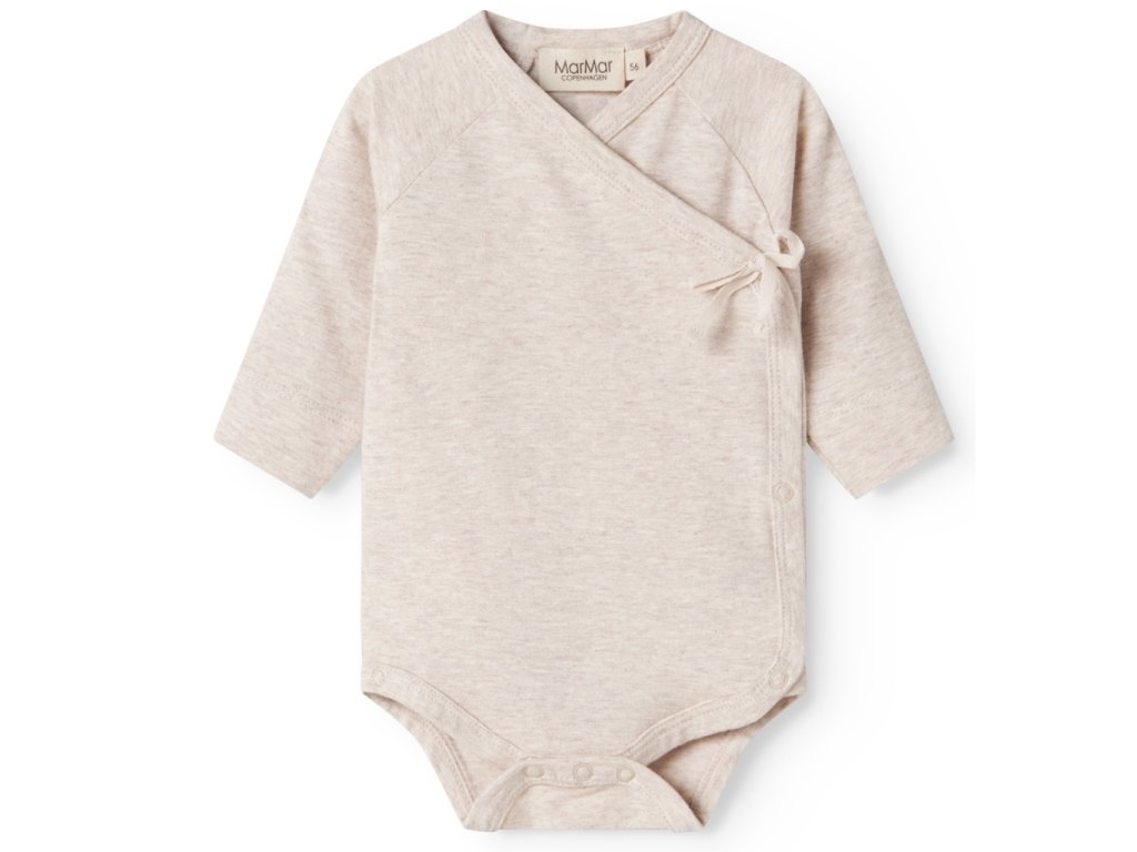 Béžové zavinovací body s dlouhým rukávem s roztomilým pikotovým stehem od značky MarMar Copenhagen. Body se zapíná i rozepíná pomocí patentek po celém obvodu, což vám maminkám i tatínkům výrazně usnadňuje jeho oblékání. Na jedné straně se zavazuje pomocí mašličky.