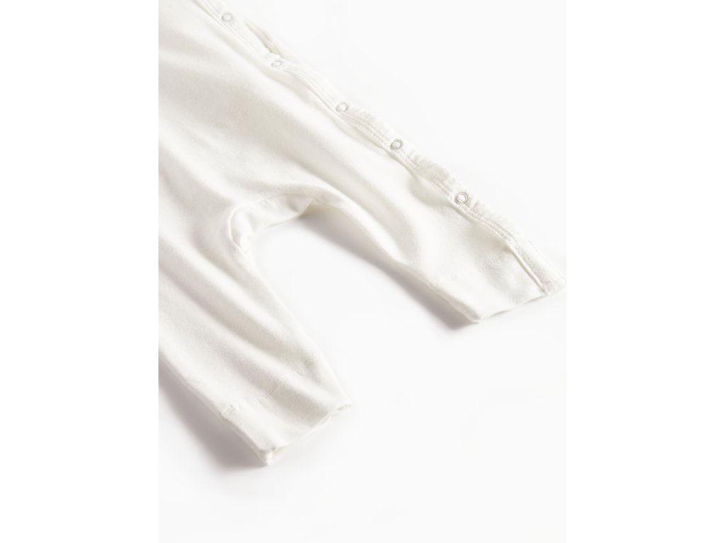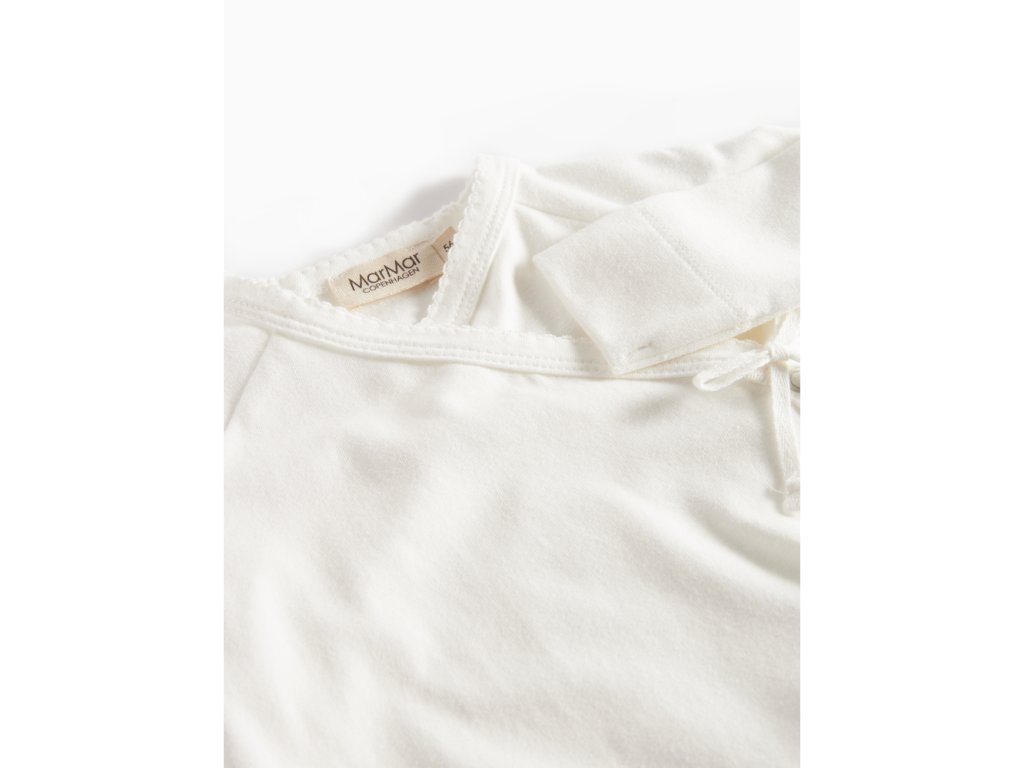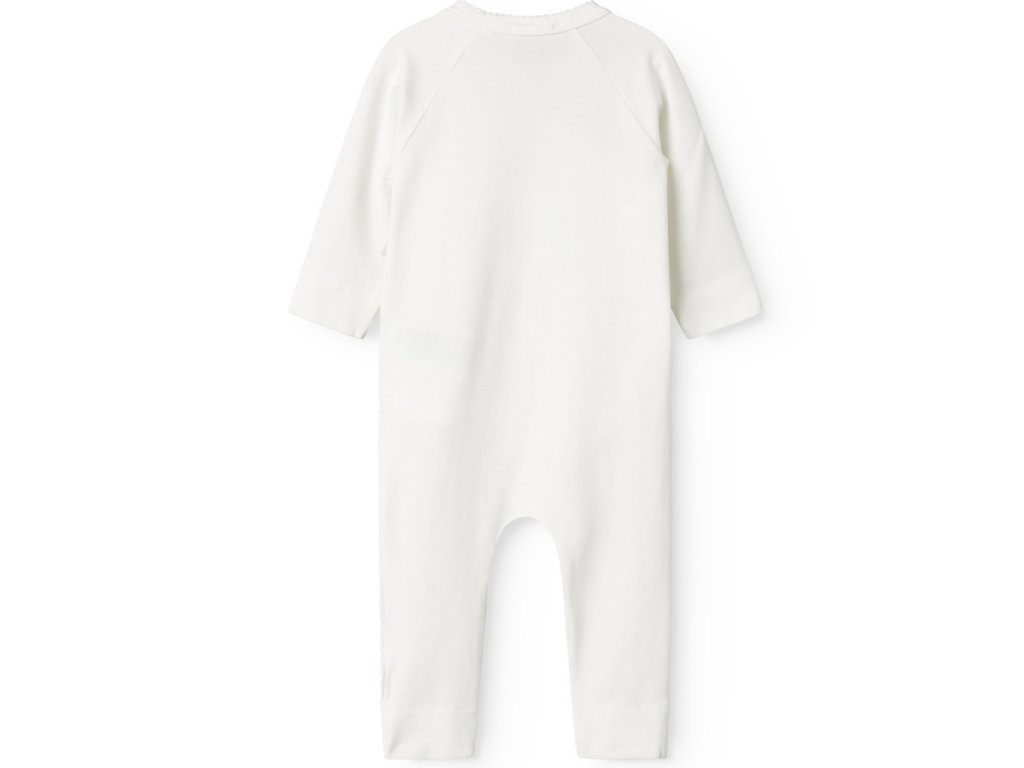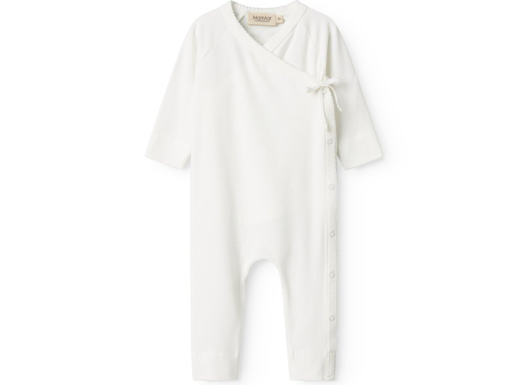Bílý zavinovací overal / pyžámko s dlouhým rukávem od značky MarMar Copenhagen. Overal se zapíná i rozepíná pomocí patentek po celém obvodu, což vám maminkám i tatínkům výrazně usnadňuje jeho oblékání. Na jedné straně se zavazuje pomocí roztomilé mašličky.