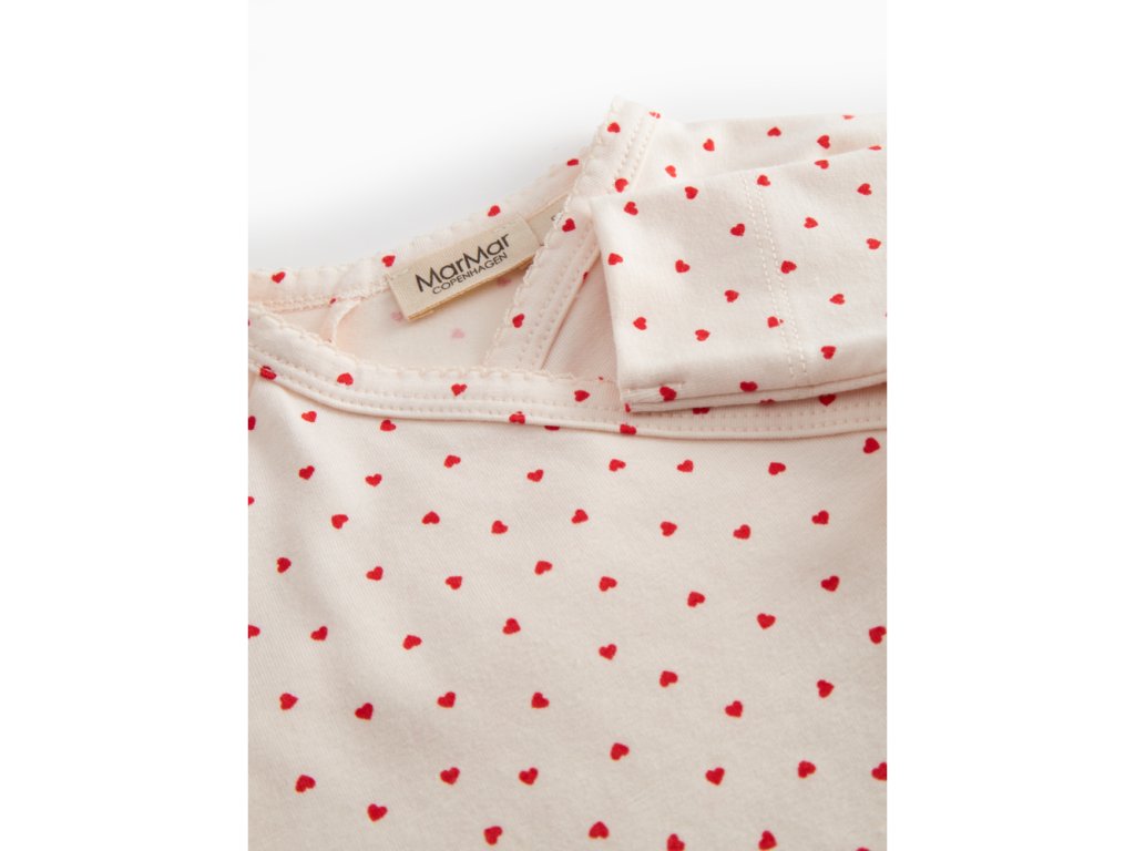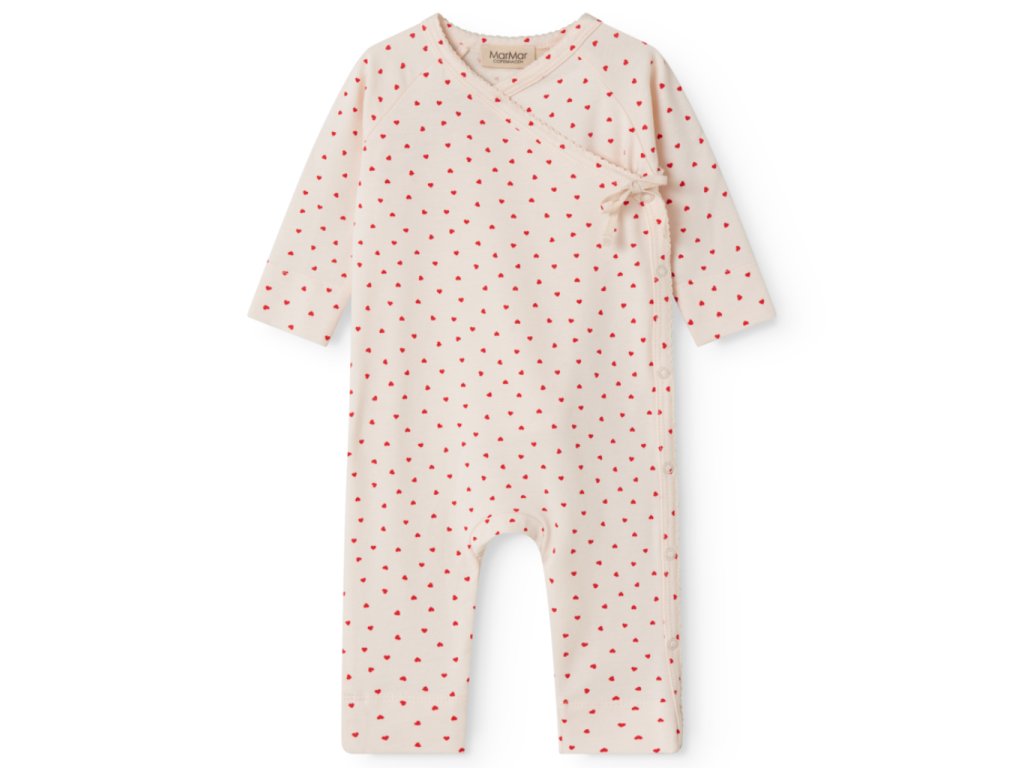 Zavinovací overal / pyžámko s dlouhým rukávem a srdíčky od značky MarMar Copenhagen. Overal se zapíná i rozepíná pomocí patentek po celém obvodu, což vám maminkám i tatínkům výrazně usnadňuje jeho oblékání.