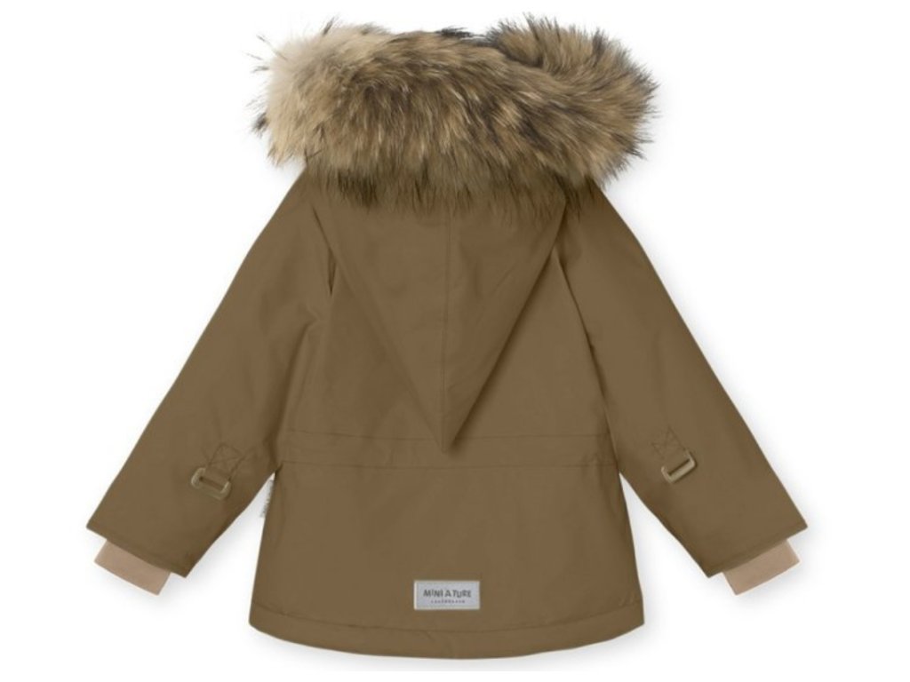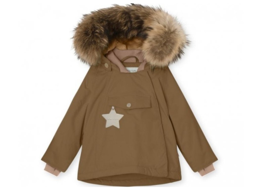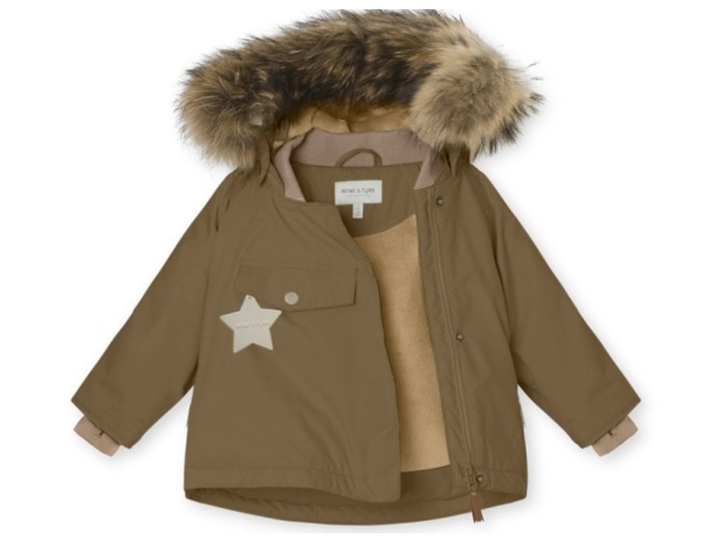 Klasická MINI A TURE zimní bunda pro děti je 100% větru a voděodolná, prodyšná a dostatečně teplá pro velmi chladné zimní dny. Rozepíná se zepředu skrytým šikmým zipem. Roztomilá špičatá kapuce je odnímatelná a lze ji utěsnit kolem hlavy pomocí elastické gumičky, aby dovnitř nefoukal vítr. Pomocí skrytého zipu lze také snadno odepnout kožešinu. Uvnitř bundy lze nastavit pas. Sněhové manžety na zápěstí jsou vyrobeny tak, aby bylo možné mít palce venku. Na rukávech jsou poutka pro připevnění palčáků a rukavic od MINI A TURE. V přední kapse je ikonická reflexní hvězda MINI A TURE.