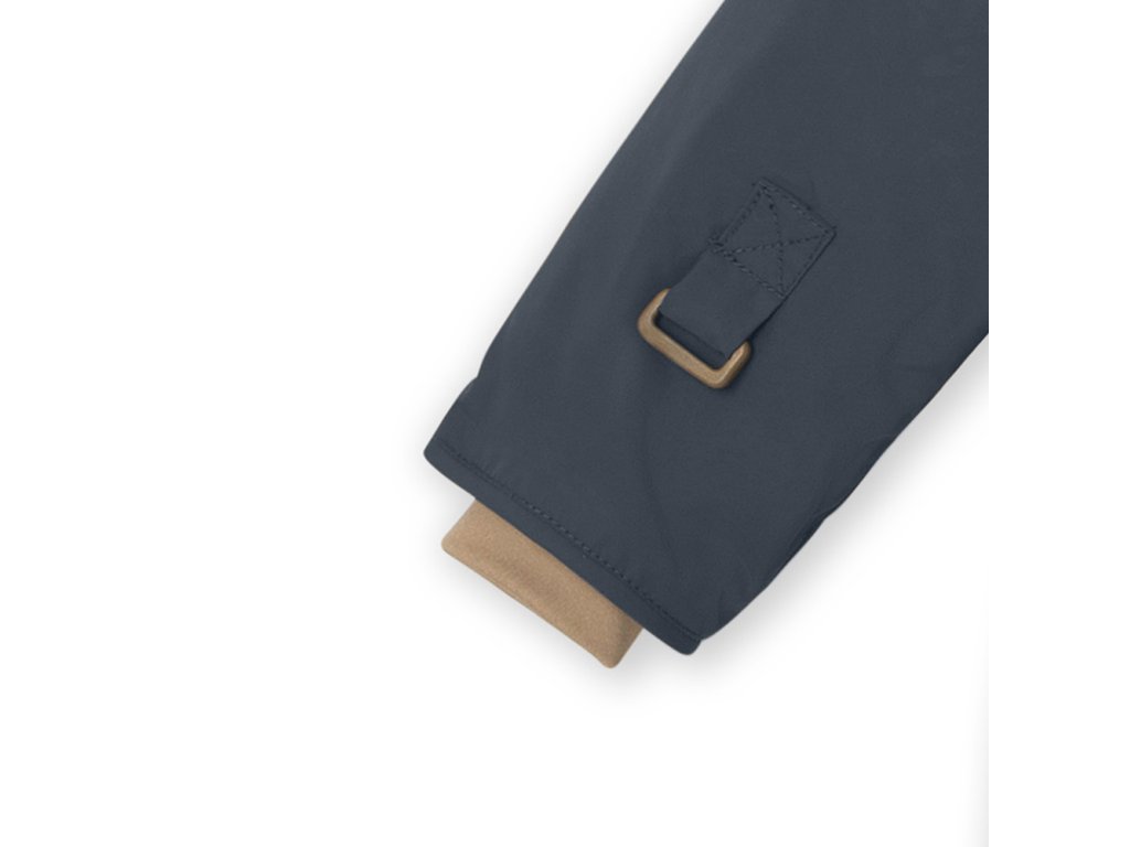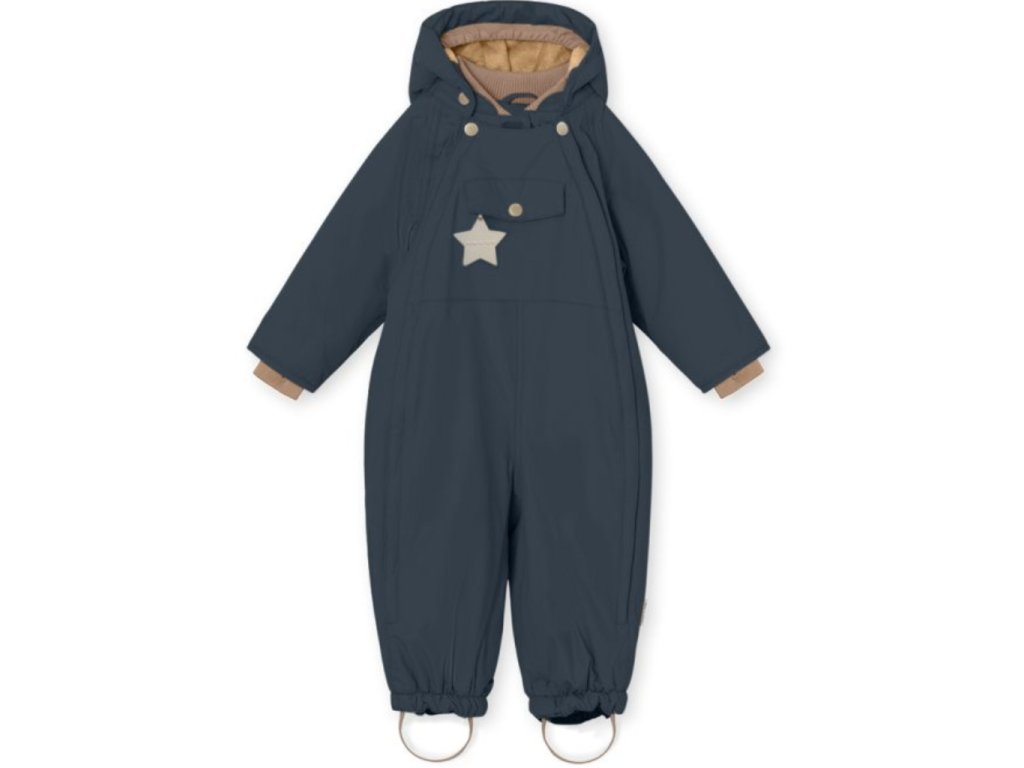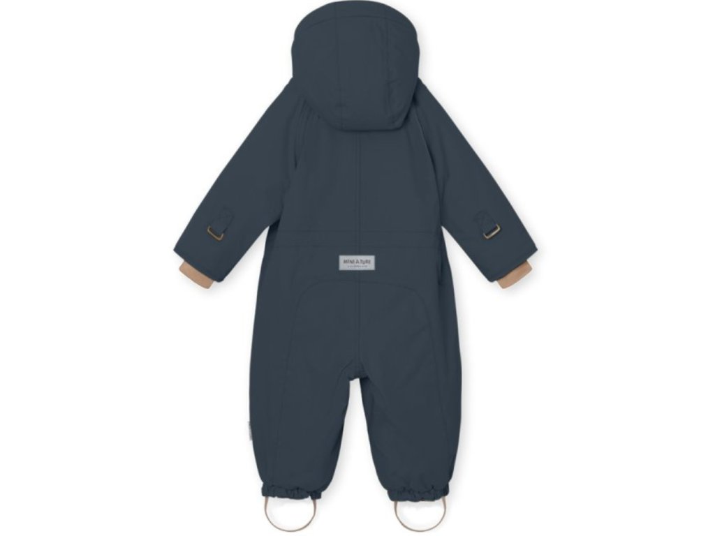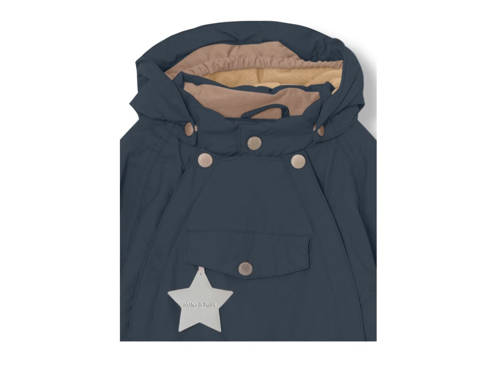 Tato dětská MINI A TURE zimní kombinéza je 100% větru a voděodolná, prodyšná a dostatečně teplá pro velmi chladné zimní dny. Otevírá se vpředu dvěma skrytými šikmými zipy. Kapuce je odnímatelná a lze ji okolo hlavy utěsnit pomocí elastické gumičky tak, aby dovnitř nefoukal vítr. Uvnitř kombinézy lze nastavit pas. Sněhové manžety na zápěstí jsou vyrobeny tak, aby bylo možné mít palce venku. Velikost 80 a 86 má žebrování kolem krku a větší velikosti mají klasický límec. Na rukávech jsou poutka pro připevnění palčáků a rukavic od MINI A TURE. V přední kapse je ikonická reflexní hvězda MINI A TURE.